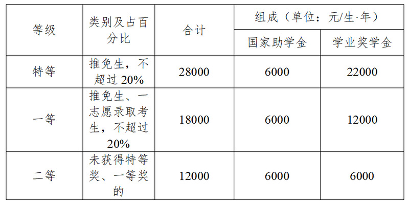 第一学年基本奖助学金等级的确定由其录取类别决定,原则上按照推免生、统考中一志愿录取的考生、其他统考生顺序择优评定,额度及其组成情况如表所示。