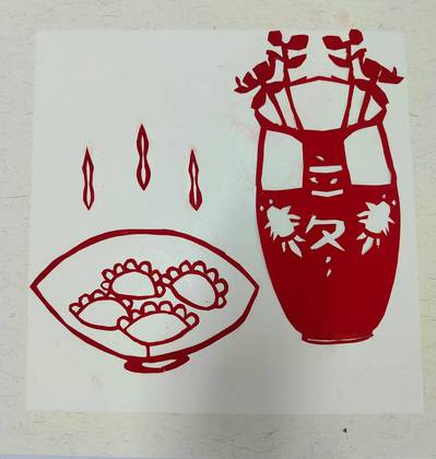 “画菊花需注意花瓣的层叠感,贴合冬日花卉的疏朗之态;剪饺子要把握弧度,体现冬日食物的饱满温暖”,从线条勾勒的轻重缓急到比例把控的细节要点,侯老师重点传授纸样绘制技巧,同学们手持红纸、紧握剪刀,循着纸样小心翼翼地剪裁刻画。有的同学细致雕琢菊花的纹路,让花瓣在红纸上舒展冬日姿态;有的同学精心剪裁饺子的轮廓,让团圆的暖意跃然纸上;还有同学将花瓶与菊花巧妙组合,让平安的期许融入剪纸之中。当红纸在指尖蜕变成型,大家细心粘贴装裱,一幅幅独具巧思的立冬主题剪纸作品新鲜出炉。成品展示环节,同学们纷纷亮出成果,脸上洋溢着满满的成就感与幸福感。