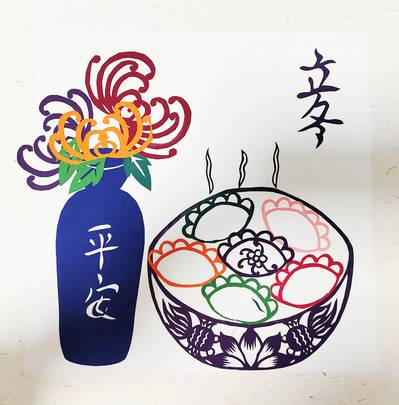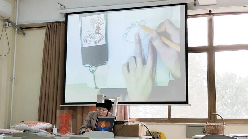 活动伊始,侯晓杰老师通过展示丰收节主题剪纸佳作与创意文创产品,直观展现剪纸文化在当代的传承脉络与创新活力。随后,老师分享了丰收节作品的构思理念,引导大家聚焦立冬节气——“立冬有赏菊、食饺的习俗,正是剪纸创作的好素材”。以花瓶、菊花、饺子为核心元素,侯老师细致拆解素材的吉祥寓意与节气关联:花瓶谐音“平安”,寄托冬日安康顺遂的期许;菊花迎冬而绽,象征坚韧高洁的品格;饺子形如元宝,蕴含立冬进补、阖家团圆的温暖情怀。