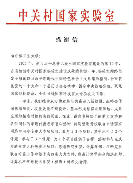 近日,中关村国家实验室向我院发来感谢信,对韩希先老师在参与实验室重大科研攻关项目中所作出的突出贡献给予高度肯定。感谢信指出,在过去一年中,双方战略合作不断深化,韩希先老师作为项目核心参与人员,在关键技术攻关中展现了扎实的专业功底和严谨的科研作风,为实验室相关任务的顺利推进提供了有力支撑。