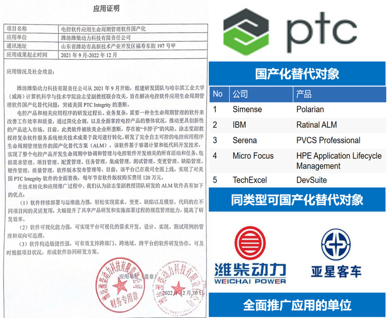 工业软件“卡脖子”是严重制约我国制造业高质量发展的关键问题。在汽车电子控制系统软件研发领域,美国PTC integrity软件形成了明显的垄断地位,严重影响了此类软件研发的项目管理和版本管理,进而制约了新型汽车发动机的研发与应用。我校研究团队在该领域深耕细作,通过与潍柴集团的深度合作,研发了完全自主可控的电控应用程序生命周期管理软件的国产化替代方案(ALM)。该软件基于容器计算和低代码开发技术,实现了整个电控产品开发生命周期中协调和管理与电控软件开发相关的所有活动和任务,包括需求管理、项目管理、配置管理、任务管理,集成管理,测试管理、变更管理、缺陷管理、硬件管理,质量管理,软件版本发布管理等。目前,该平台已在潍柴集团及下属企业,如亚星客车等,全面上线,实现了对美国PTC Integrity软件的全面替换,每年节省软件版权购买费用数百万元,避免了由于“软件断供”风险导致的经济损失。