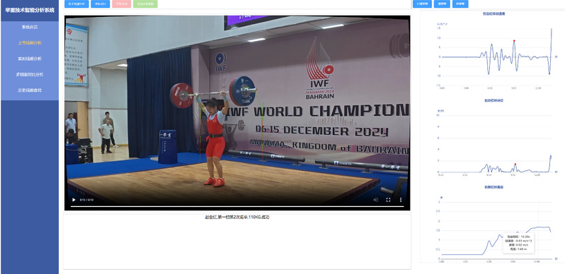 举重运动要求力量、技巧与精神的全面融合,但传统训练模式多依赖教练经验与运动员自我感知,难以精确评估训练成效。运动员在高强度训练中易受伤,特别是腰、腕、肩、肘等关节。比赛中,竞技状态、对手实力及环境等变量均影响结果。亟需引入科学化手段,优化训练动作与技巧,提升训练效率,减少伤害风险,并科学规划比赛战术。此举对增强运动员竞争力、确保训练安全及推动举重运动发展至关重要。通过对举重运动员在训练或比赛过程中采集到的视频进行实时智能分析,利用目标检测、目标跟踪、动作识别等视频分析技术对不同视角下举重技术动作和训练负荷进行实时监控与分析反馈,实现了杠铃轨迹的自动识别与关键点标识、杠铃质量的自动识别、举重专项动作的自动识别,完成对举重训练中专项动作、杠铃轨迹、杠铃质量、训练组数等关键参数的精确统计与多维分析。该技术优势在于无感运行,不干扰运动员的正常训练或比赛;另外,在数据分析方面表现出更高的精准度,分析结果呈现更为直观,涵盖维度更加丰富。举重技术智能分析系统一方面可科学辅助举重运动员日常训练,全时监测运动员日常训练,分析运动员专项训练动作的类别、重量、杠铃轨迹、训练次数及成功与否等信息,并生成训练报告,支撑运动员和教练员来有依据有目标的科学优化训练方案;另一方面,可支持举重比赛实时数据分析;在重要赛事中,实时分析并获取主要竞争对手的比赛状态,为教练优化比赛策略提供科技支撑。该系统已部署在中国举重福建马江基地,用于国家举重队的日常训练技术支持,受到举重奥运冠军和教练员的重点关注,并已获得国家体育总局、中国体育科学学会的科研项目连续资助,在迭代建设后可为中国举重队的训练与比赛提供智慧决策。
